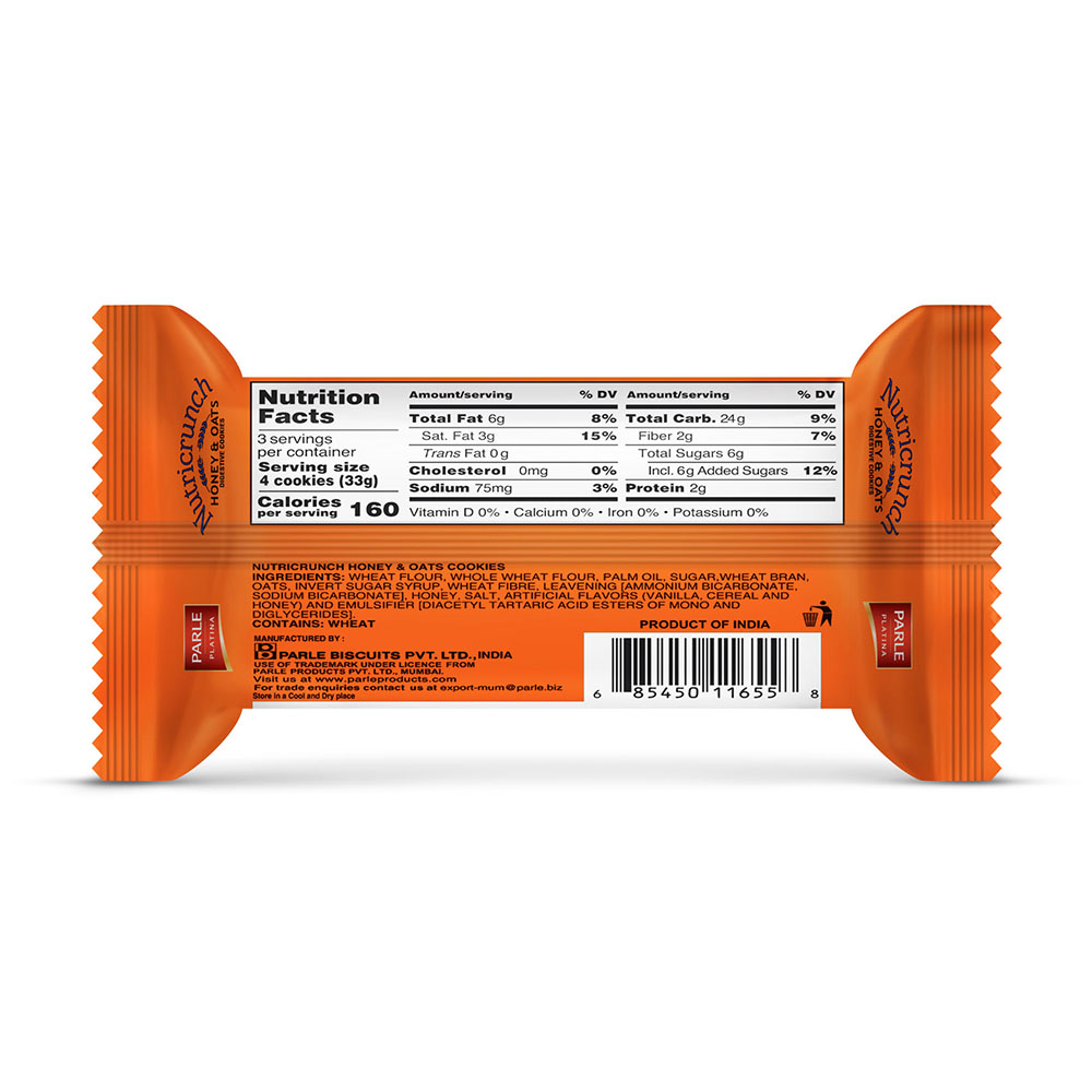 Parle Nutri Crunch Honey & Oats Cookies are a tasty and healthy snack. Made with oats and honey, they offer fiber and natural sweetness. These cookies have a light crunch and mild sweetness, making them great with tea or as a snack anytime.